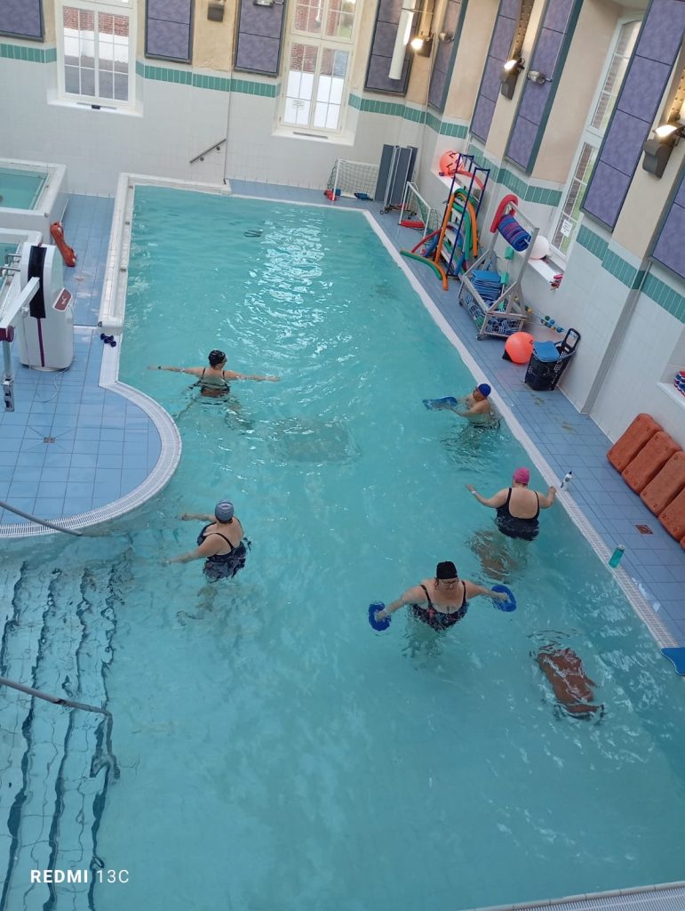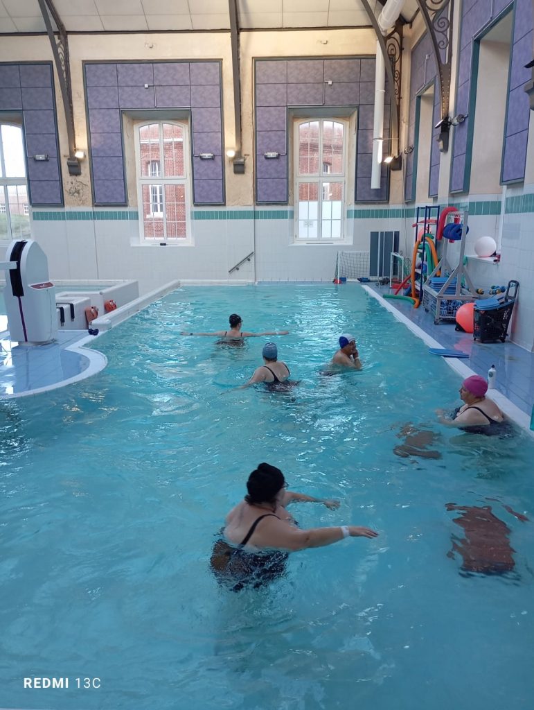 Un professionnel chargé de la surveillance est présent en permanence au sein du bassin aquatique. L’activité de la balnéothérapie, encadré par un enseignant en activité physique adaptée, permet aux patients une familiarisation avec le milieu aquatique, un travail du contrôle respiratoire, un réapprentissage du contrôle postural et de la nage en situation de handicap, un travail musculaire spécifique, une prise sensorielle plurimodale qui favorise le retour à la pleine conscience de l’environnement.